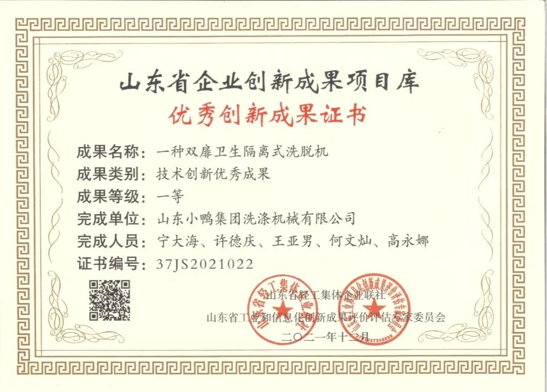 喜報(bào)!小鴨洗滌機(jī)械獲技術(shù)創(chuàng)新優(yōu)秀成果