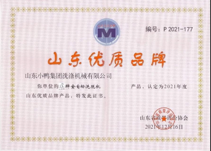 喜報(bào)!小鴨洗滌機(jī)械全自動(dòng)洗脫機(jī)獲山東優(yōu)質(zhì)品牌產(chǎn)品稱號(hào)